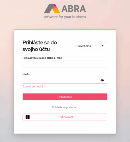 1. Prejdite na adresu Zákazníckeho portálu (zp.abra.eu/sk). Budete automaticky presmerovaní na zp.apps.abra.software. Ide o zabezpečený portál ABRA Apps, ktorý patrí pod našu doménu.